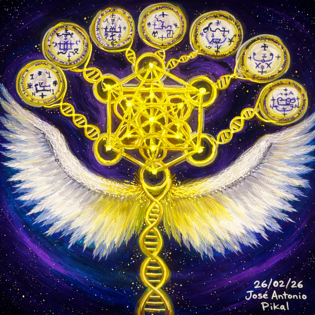 Integración de polaridades. El eje central se vuelve ADN de luz: memoria, origen y reconciliación.