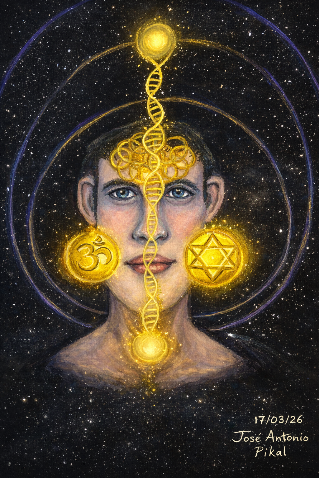 Cada pieza nace como una experiencia introspectiva y se convierte en un mapa simbólico del ser: la percepción que despierta, la memoria que se reconoce, la emoción que se ordena y la conciencia que se expande. El cosmos, la energía y la figura humana aparecen no como conceptos abstractos, sino como metáforas de los estados internos que atravesamos en nuestro proceso de evolución personal.